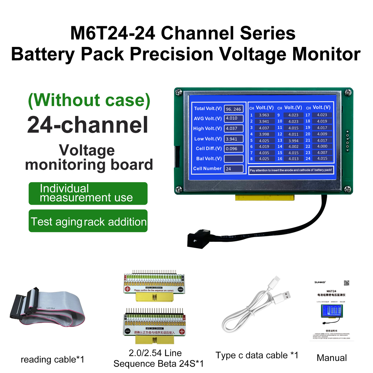 M6T24-24 Channel series battery pack precision voltage monitor, using STMicroelectronics' latest large-scale high-speed MCU chip to perform real-time precision monitoring of each unit of the lithium battery pack.The voltage information collected by the chip is stored and compared, and the data is quickly displayed on a 5.0-inch LCD color screen after processing.